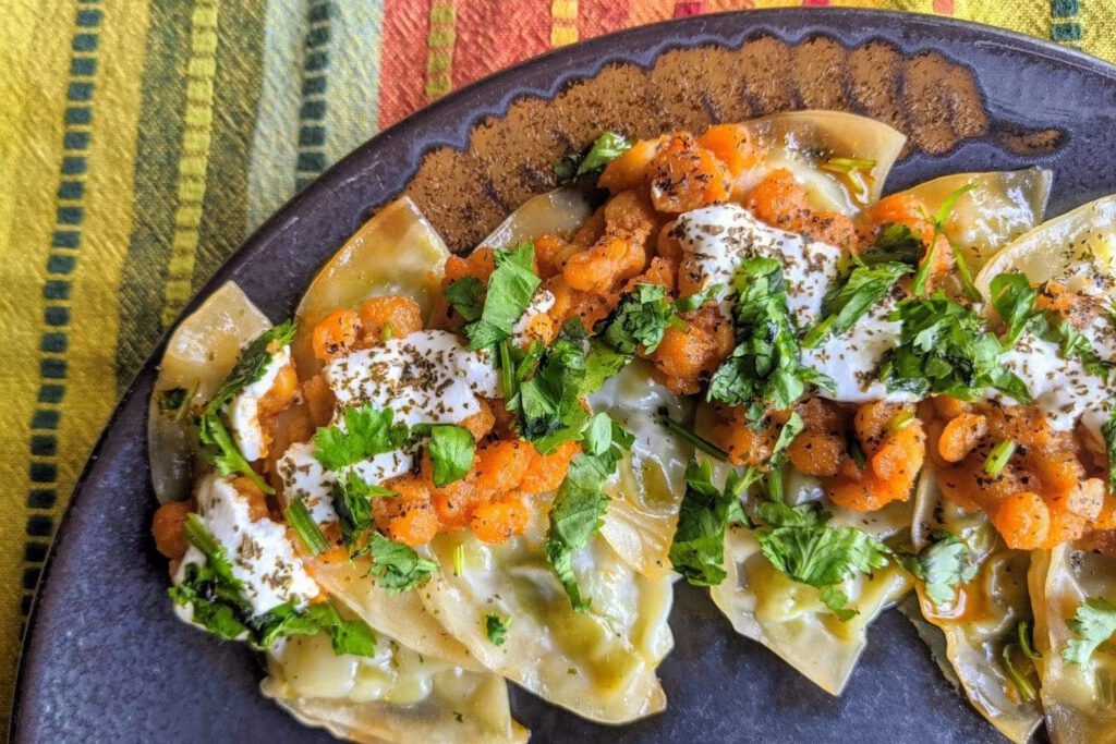 Aushak (Leek Dumplings with Split Pea Yogurt Sauce)