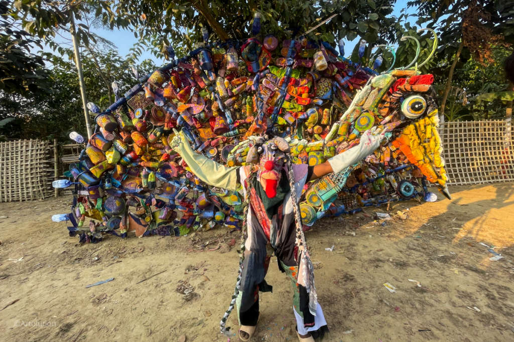 Rohingya artist Mohammad Noor is performing in a costume which was made out of recycled fabrics collected from local garment factories surrounding Uhkia and Cox’s Bazar District. The costume was constructed by Rohingya community artists and youth. The artists are teaching children how to cultivate an interdisciplinary approach to making art so that their imaginations can flourish.