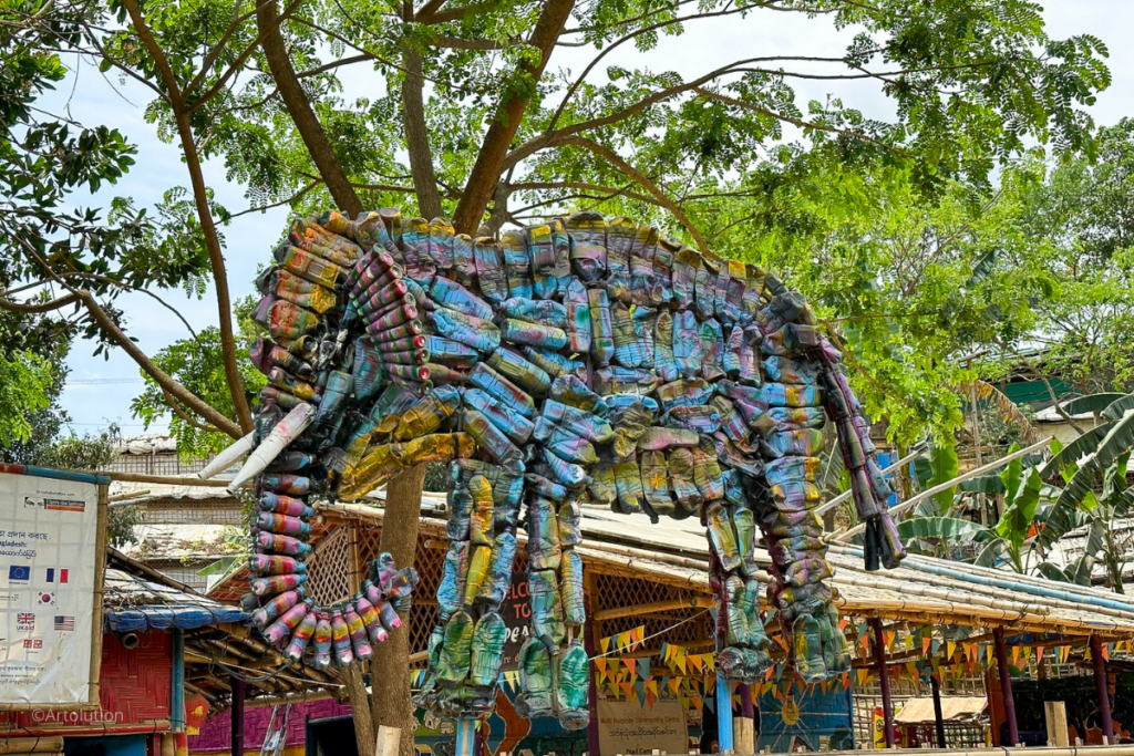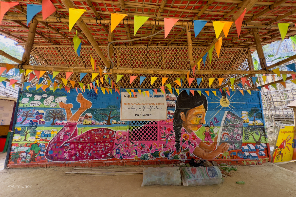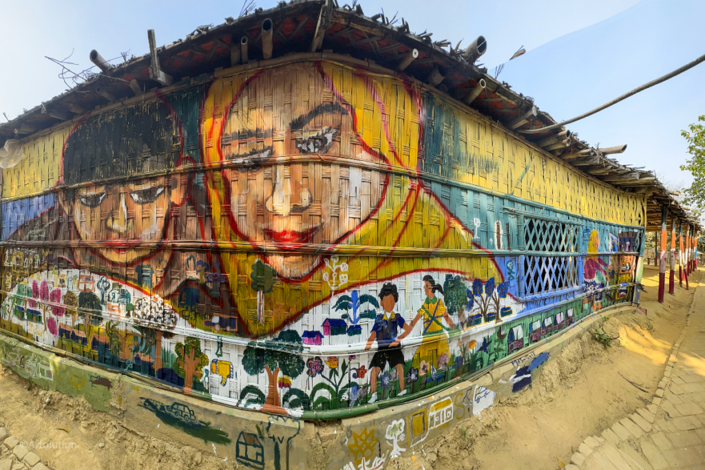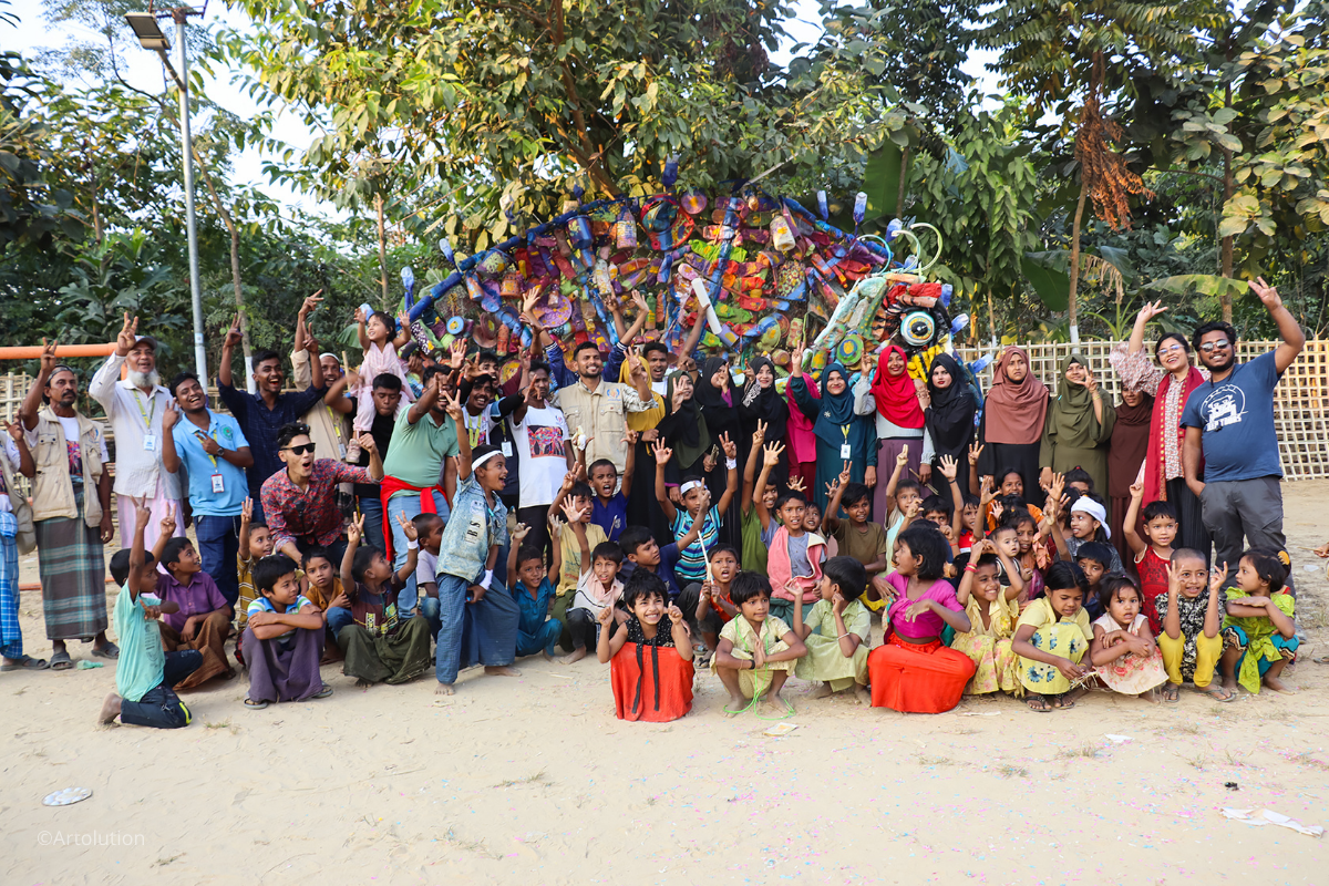 Artolution is a global non-profit organization that seeks to strengthen crisis-affected communities through collaborative artmaking. Artolution has been operating in the Rohingya refugee camps of Bangladesh since early 2018, partnering with UNHCR, UNICEF and many other agencies to bring arts programming that impacts mental health, livelihoods and social inclusion for thousands of Rohingya youth. A team of Rohingya artists completed an exhibition that includes 40 murals, 5 interactive recycled musical sculptures and 3 major retrospective pieces.