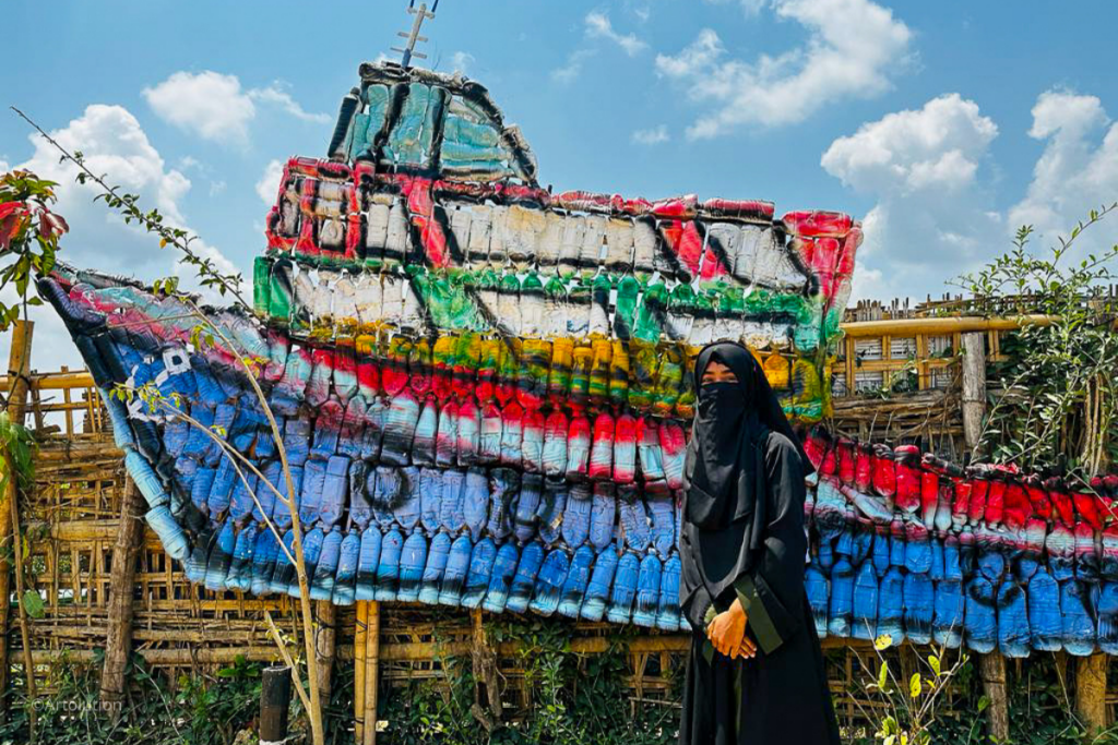 Somira, Community Lead Artist of Rohingya Artolution, is standing in front of a collaborative Foundstrument Soundstrument project. More than 50 community artists and kids participated in this project, utilizing discarded single-use water bottles to build a ship. Ships are an important representation of Rohingya life in Cox’s Bazar because many Rohingya refugees came to Bangladesh by ship after fleeing violence in Myanmar.
