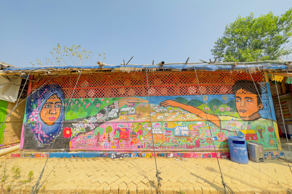 This mural depicts the importance of education for all Rohingya children. A boy and a girl are studying and attending school together. The lead artist of this mural, Anuwar Faruk, said, “Through our painting and art, we always try to portray social messages that are relatable to our community. The Rohingya girls are often dropped out from school and child marriage is very common. We want to promote the importance of equality in terms of education.”