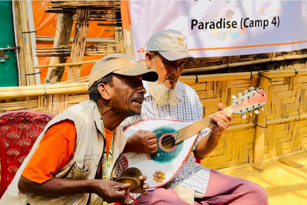Nobi Hussein and Boshir Ullah perform Tarana Music for the Rohingya Community. 54-year-old Nobi Hossein fled violence in Myanmar and arrived in Bangladesh in 2017. Before joining Artolution, he used to sing traditional Kirat (Islamic songs) in the mosque in the camp.